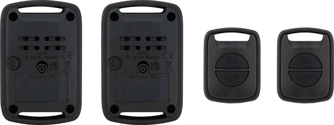 Lieferumfang:2 x ABUS Alarmbox RC2 x Fernbedienung ABUS Alarmbox RC4 x Batterie CR2 (integriert)4 x Kabelbinder
