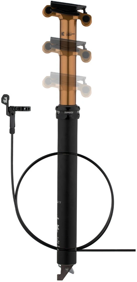 Die Transfer Factory Vario-Sattelstütze von Fox Racing Shox mit Genuine-Kashima-Coat-Beschichtung und 125 mm Hub glänzt mit geringer Gesamtlänge und Einstecktiefe. Das macht sie kompakter und leichter. Zwei unterschiedliche Hebeldesigns sorgen dafür, dass die Sattelstütze zu jedem Antrieb passt. Der Bowdenzug zur Ansteuerung wird innen verlegt. Zudem wurde die Wartungsfreundlichkeit verbessert.