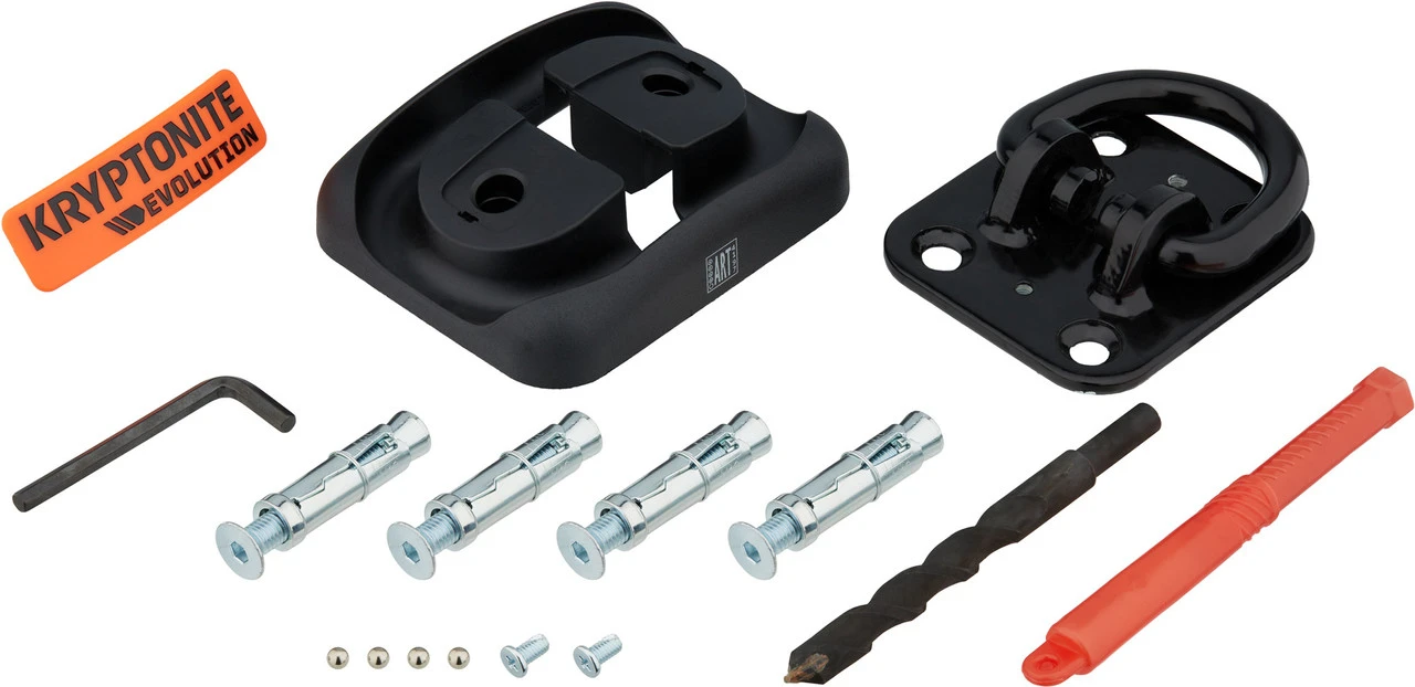 Lieferumfang:1 x Bodenverankerung Kryptonite Evolution4 x Sechskantschraube4 x Spreizmutter2 x Kreuzschlitz-Schraube4 x Lagerkugel, gehärtet1 x Innensechskantschlüssel 6 mm1 x Bit für Beton, 16 mm