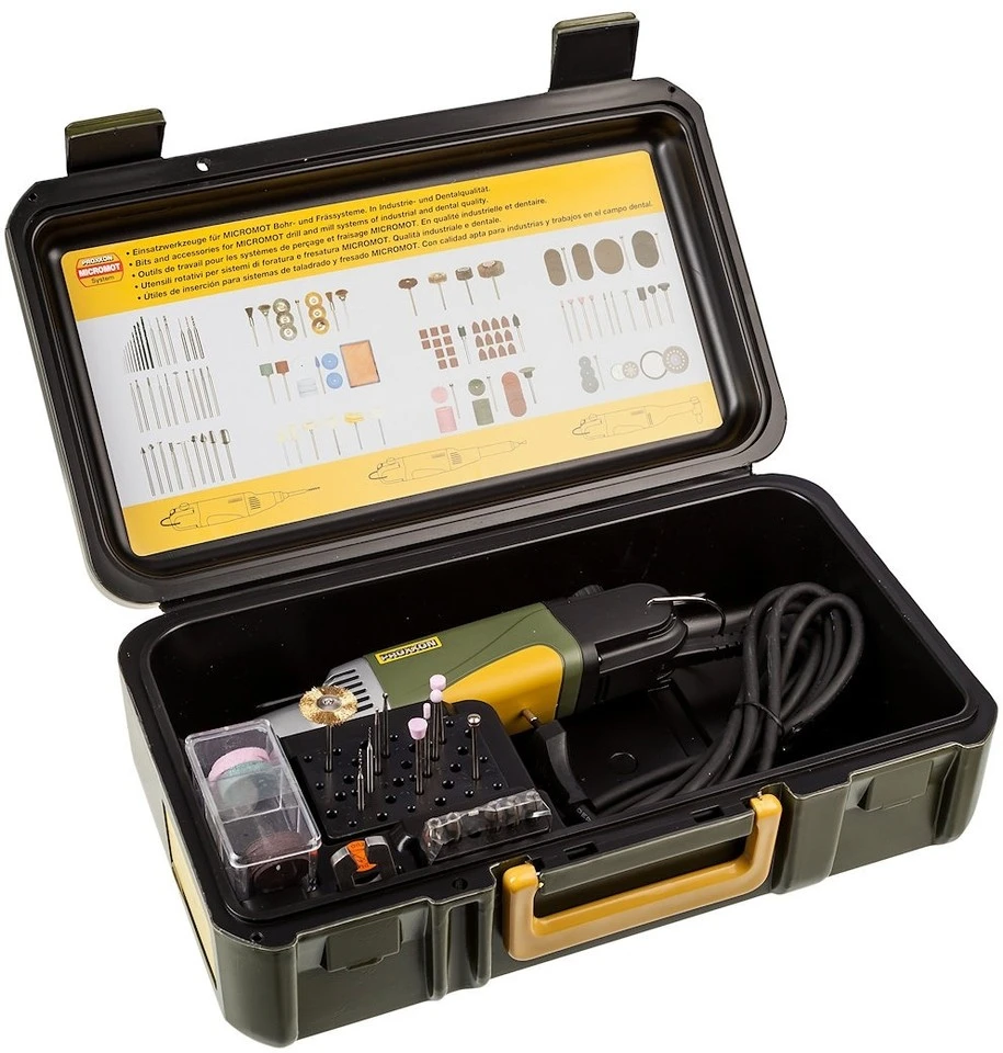Technische Daten:Material Getriebekopf:stabiler Alu-DruckgussMaterial Hauptgehäuse:Polyamid, glasfaserverstärkt / Weichkomponente im GriffbereichMaterial Koffer:PolypropylenDrehzahl:5.000 – 20.000 / MinLeistungsaufnahme (max.):100 WSpannung:230 VLänge:230 mmGröße Stahlspannzangen:1,0 / 1,5 / 2,0 / 2,4 / 3,0 / 3,2 mmSchutzklasse:schutzisoliert nach Klasse 2Sonstiges:mit 20-mm-MICROMOT-Systempassung vorne für den Einsatz in Bohr- und HorizontalständernFeatures:Schnellläufer mit balanciertem Gleichstrom-DC-Spezialmotorstufenlose elektronische Drehzahlregelung (Vollwellenelektronik)doppelt kugelgelagerte Spindel aus geschliffenem Stahlzum Werkzeugwechsel per Knopfdruck arretierbarschlanker Gehäusekopf aus Alu-Druckgussfür präzise Kugellagerpassungenmehr Stabilität bei extremer Belastungleiser, durchzugskräftiger 100-W-Motorgeregelt mit Vollwellenelektronik von 5000 – 22000 / Minkompromisslose Sicherheit durch Schutzisolation nach Klasse 2mit 34 Einsatzwerkzeugen in Industriequalitätalle Schäfte mit 2,35 mm Durchmesserkomplett mit sechs 3-fach geschlitzten Stahlspannzangen von 1,0 – 3,2 mmAufbewahrungskoffer aus hochwertigem Polypropylen – formschön, superstabil und groß genugHerstellernummer:28481