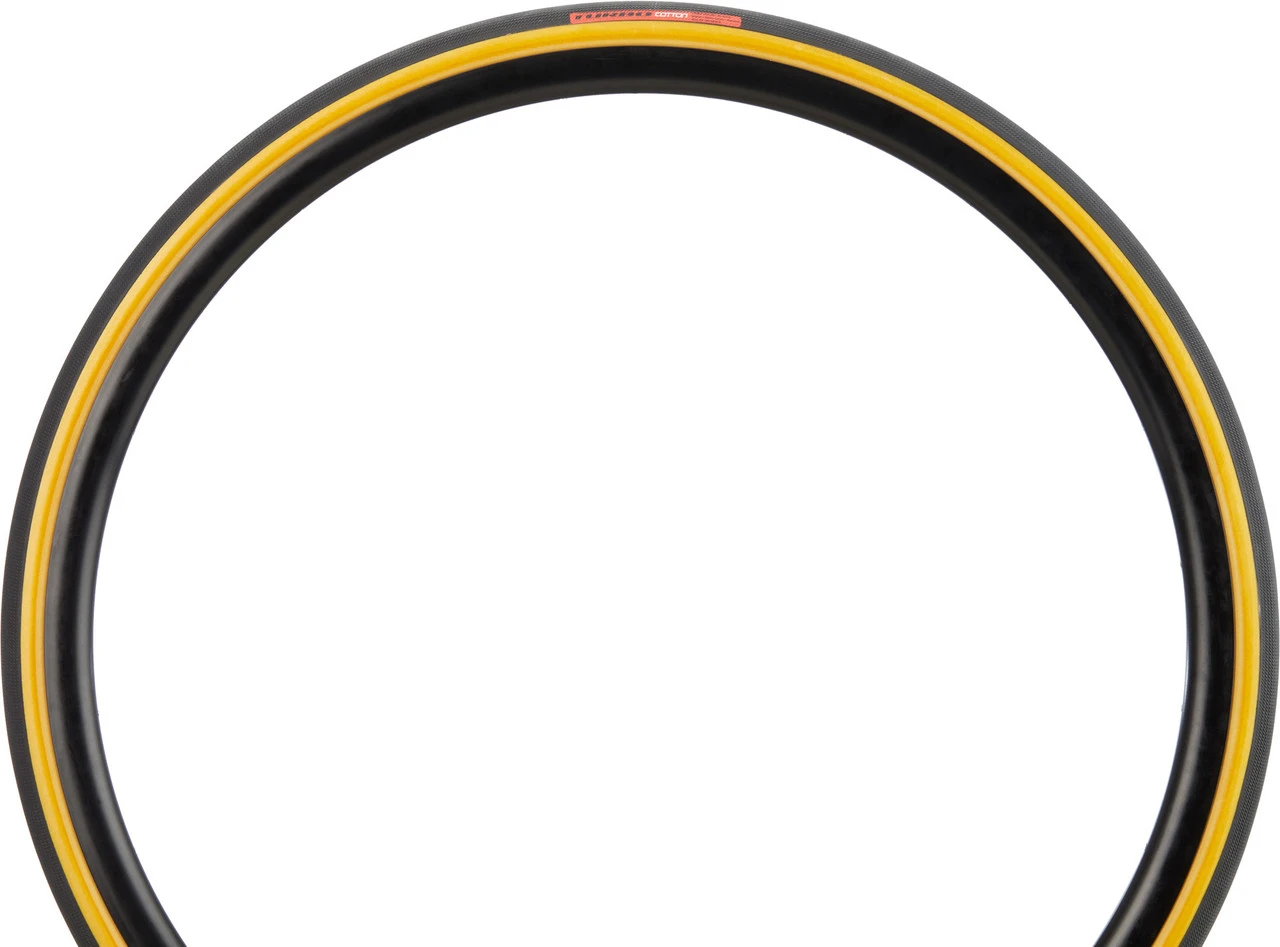 Hochleistungs-Rennradreifen, entwickelt für schwere Klassiker-Rennenschnell, leicht und geschmeidiganpassungsfähige Karkassetransparente Seitenwände, sodass der braune Kern durchschimmert